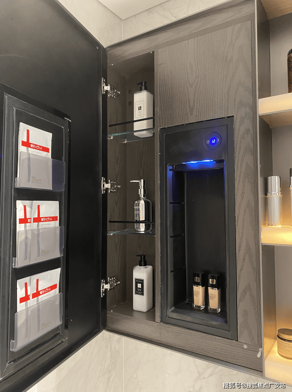 奢石台面,皮革饰面柜抽屉,侧端设置金属收纳开放格;定制镜柜,中间的透光玉石直接提升了高级感,