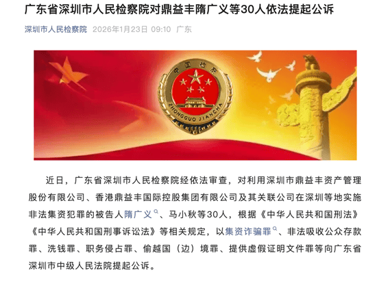 1月23日,广东省深圳市人民检察院公告称,近日经依法审查,对利用深圳市鼎益丰资产管理股份有限公司、香港鼎益丰国际控股集团有限公司及其关联公司在深圳等地从事非法集资犯罪的被告人隋广义、马小秋等30人,根据《中华人民共和国刑法》《中华人民共和国刑事诉讼法》等相关规定,以集资诈骗罪、非法吸收公众存款罪、洗钱罪、职务侵占罪、偷越国(边)境罪、提供虚假证明文件罪等向广东省深圳市中级人民法院提起公诉。